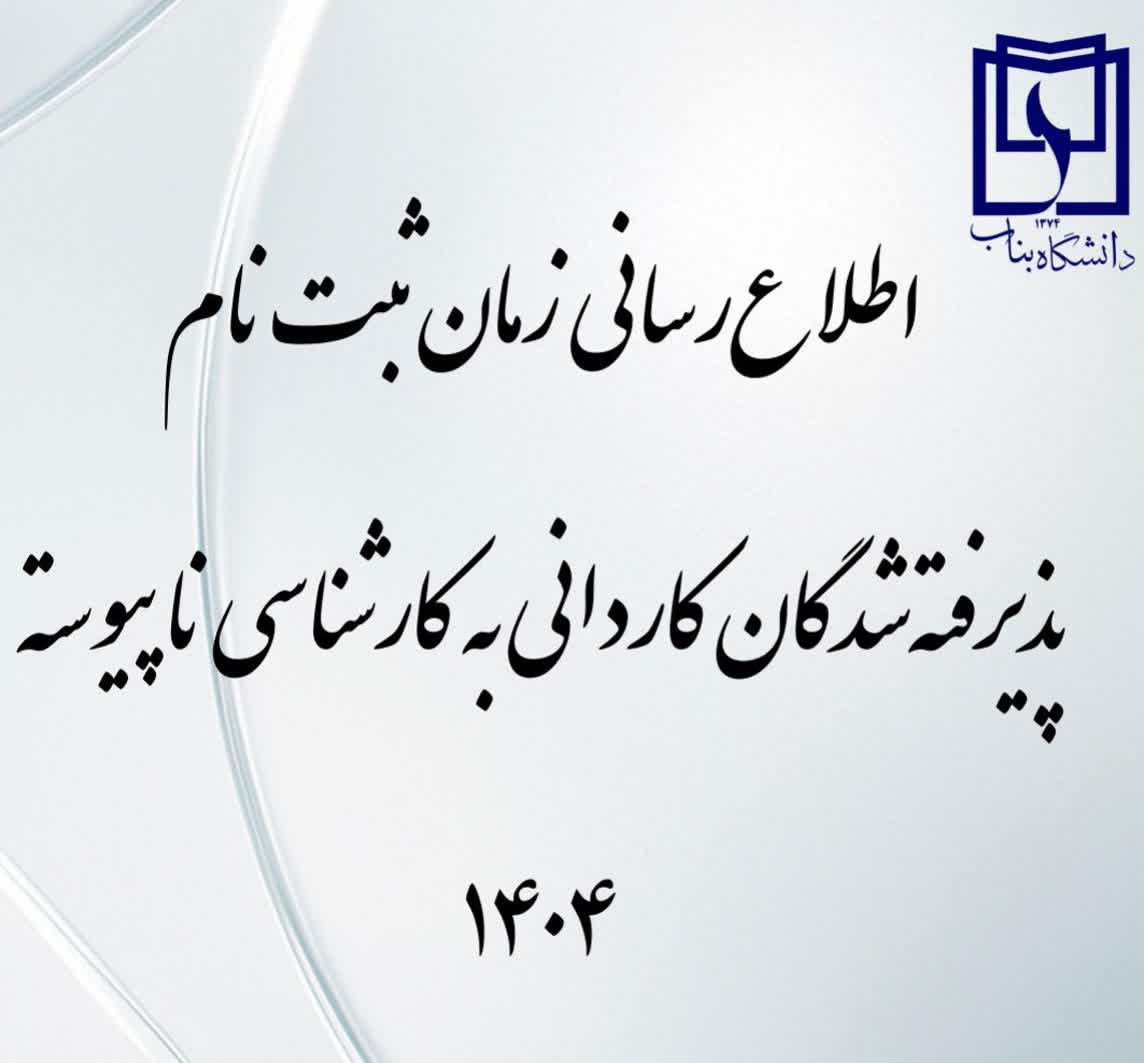 به گزارش روابط عمومی دانشگاه بناب،ضمن تبریک پذیرش در آزمون کاردانی به کارشناسی ناپیوسته سال ۱۴۰۳ به تمامی پذیرفته‌شدگان، به استحضار می‌رساند زمان دقیق ثبت‌نام اینترنتی و تحویل حضوری مدارک متعاقباً و منحصراً از طریق پایگاه رسمی دانشگاه بناب اعلام خواهد شد.