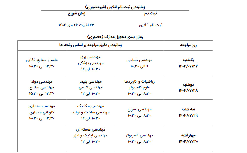پس از تکمیل ثبت‌نام اینترنتی،تحویل حضوری مدارک مطابق با برنامه زمان‌بندی تفکیکی که در جدول زیر ارائه شده است انجام خواهد شد.