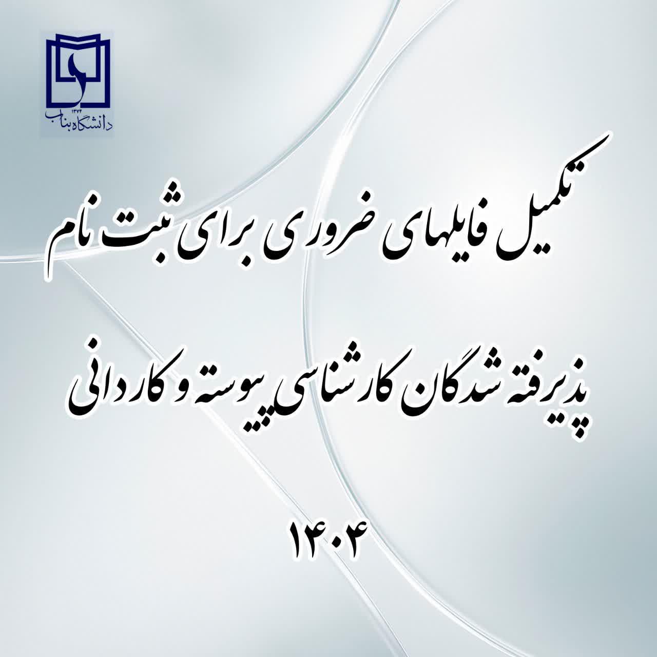 تکمیل فایلهای ارائه شده برای ثبت نام پذیرفته شدگان کارشناسی پیوسته و کاردانی 1404 ضروری می باشد.
