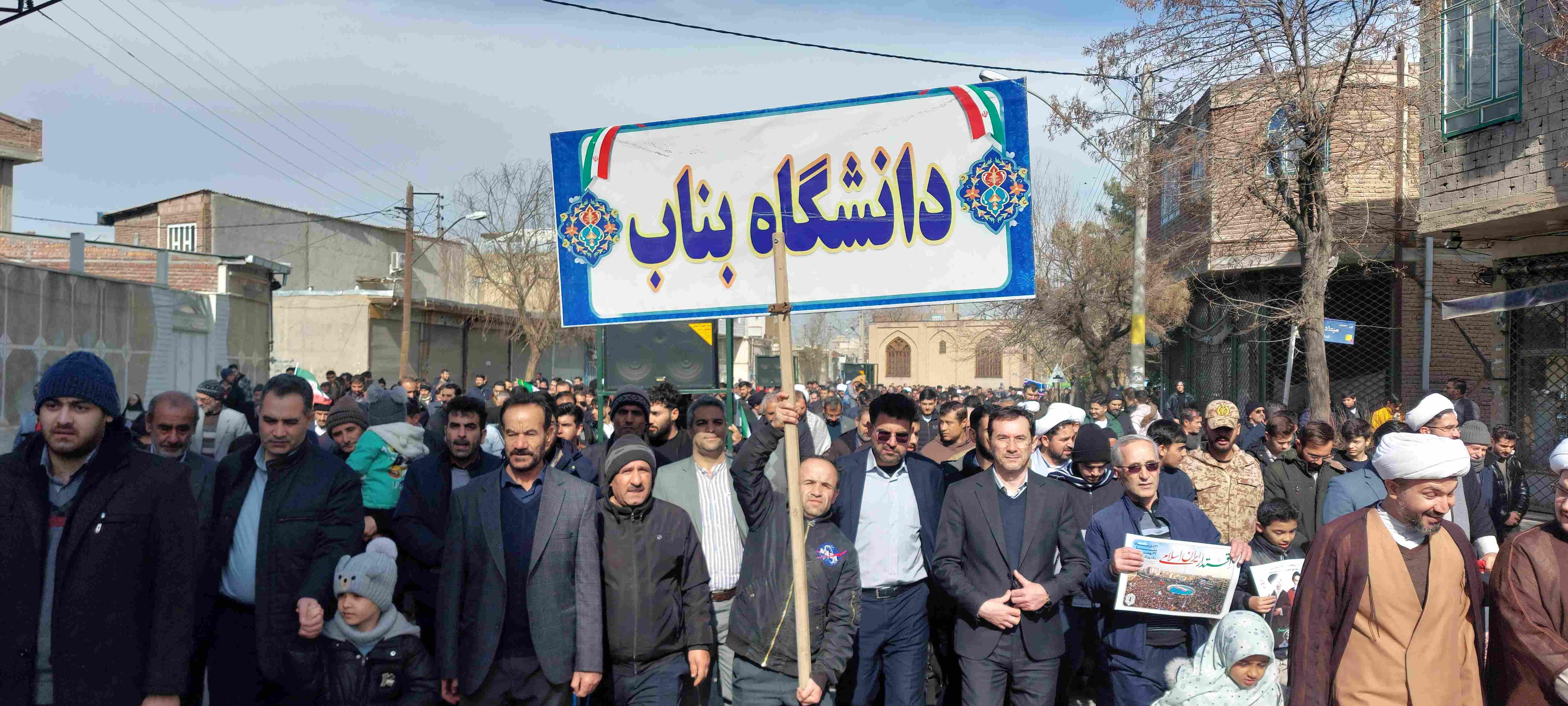 به گزارش روابط عمومی دانشگاه بناب، دانشگاهیان این مرکز آموزش عالی اعم از استادان، کارکنان و دانشجویان انقلابی، همگام و هم صدا با مردم غیرتمند و بصیر شهرستان بناب، حضوری حماسی و دشمن شکن در راهپیمایی یوم الله ۲۲ بهمن داشتند.